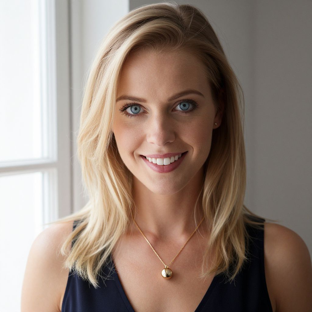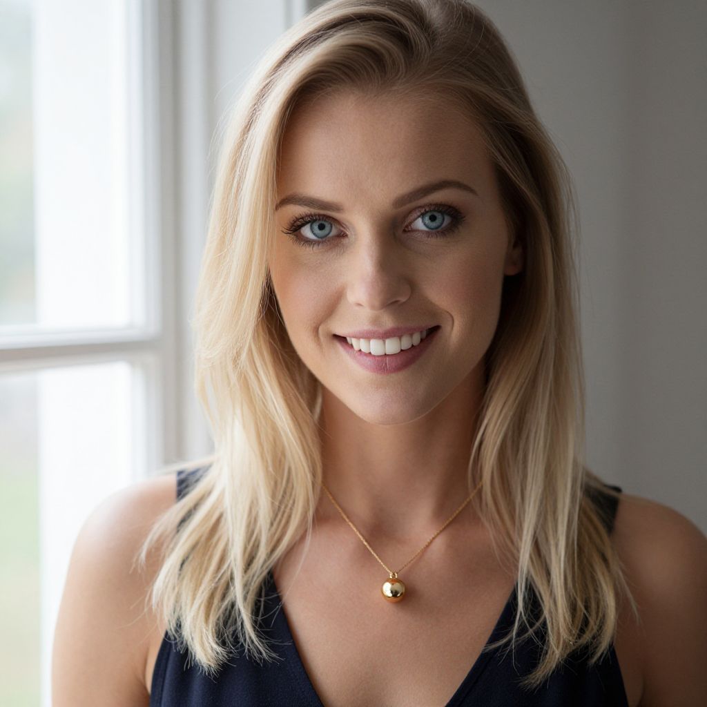 Blonde-haired woman with striking blue eyes and a warm smile stands indoors near a window, wearing a delicate gold necklace with a spherical pendant and a dark sleeveless top.