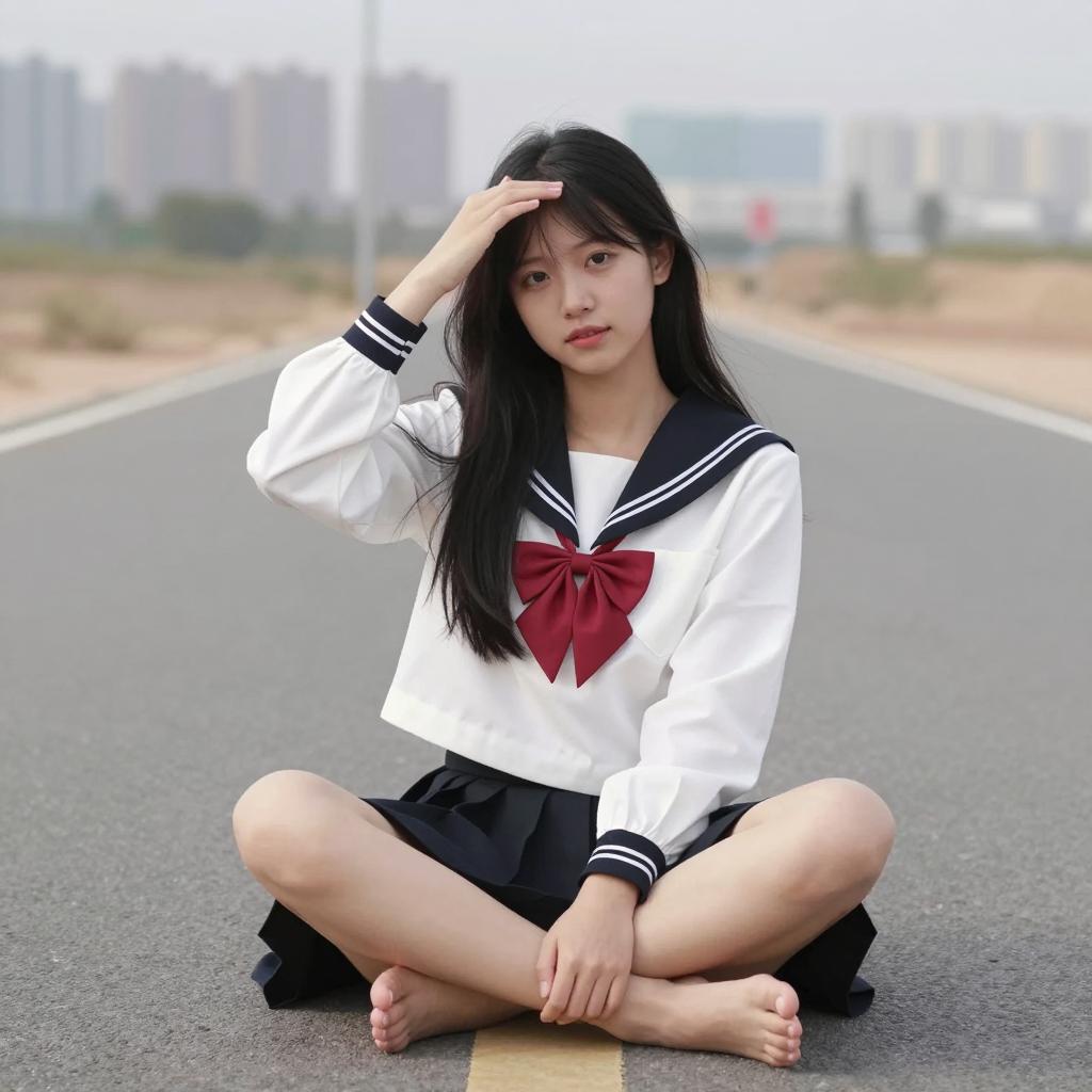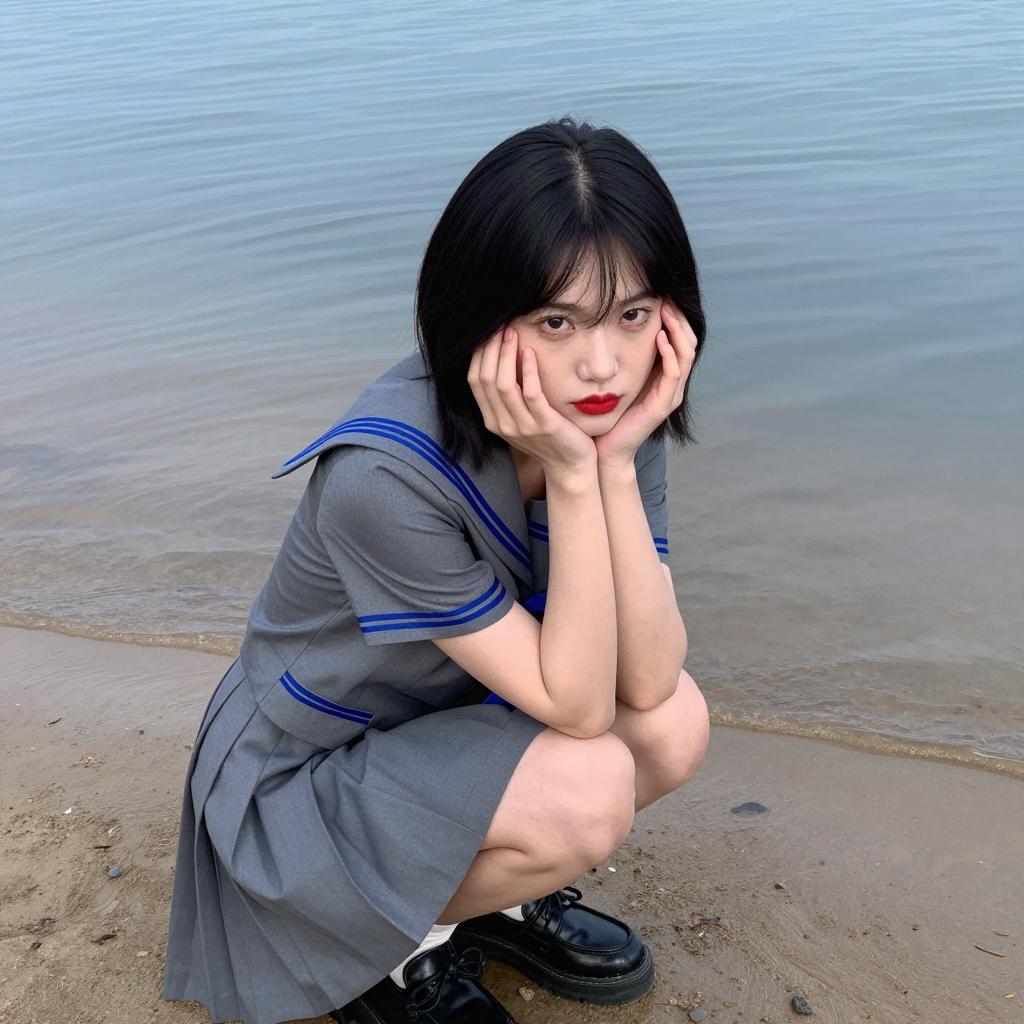 Young woman with pale skin, black hair, and red lipstick, crouches on sandy shore by blue water. Wearing gray sailor-style dress with blue stripes, black shoes. Hands on cheeks, intense expression. Background: calm water. Casual, natural light.