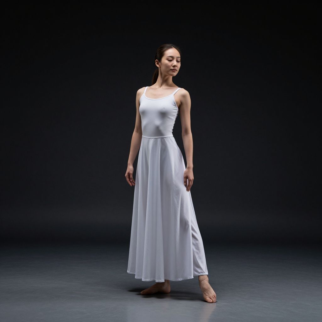 Simple Contemporary Dance Costume, woman in white dress standing in a dark room