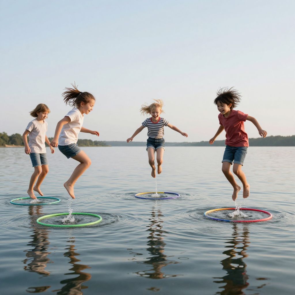 Photograph of four children jumping on colorful hula hoops in calm lake water, bright daylight, clear blue sky, distant shoreline.