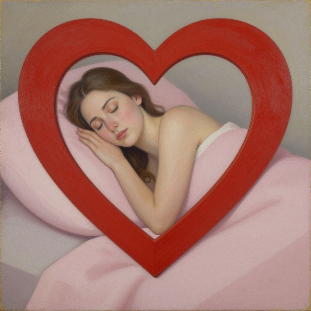 Painting of a sleeping woman with closed eyes, brown hair, and fair skin, wrapped in a white blanket, inside a red heart-shaped frame against