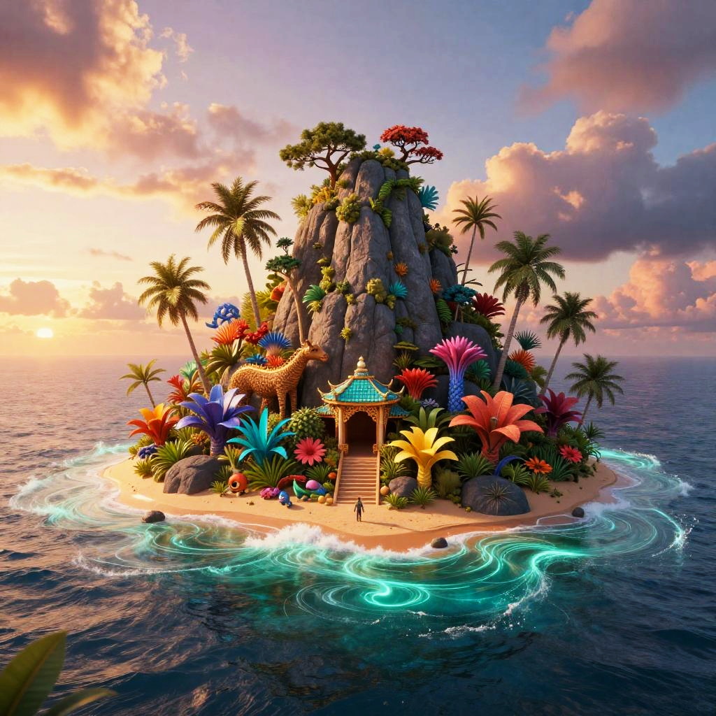 Island maker crafting a mystical tropical paradise from swirling sands and glowing waters, vibrant colors blending with dynamic light effects, surrounded by exotic flora and fauna under a radiant sunset sky, cinematic atmosphere, high detail