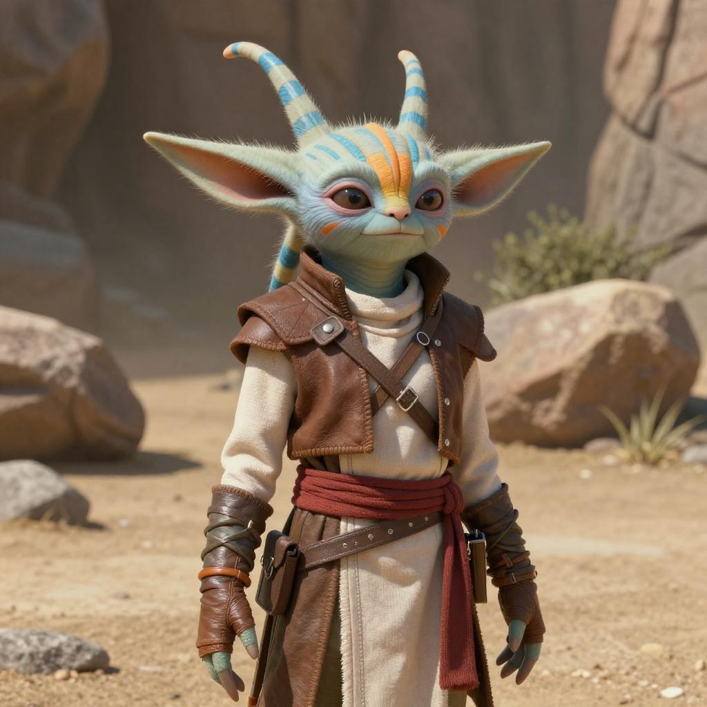 CGI image of a small, black, horned, humanoid creature with glowing yellow eyes and ornate jewelry, standing in a sandy desert.