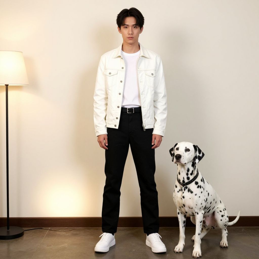 Photorealistic CGI of an Asian man with black hair, wearing a black suit and green-tinted glasses, smiling beside a grey and white Grey