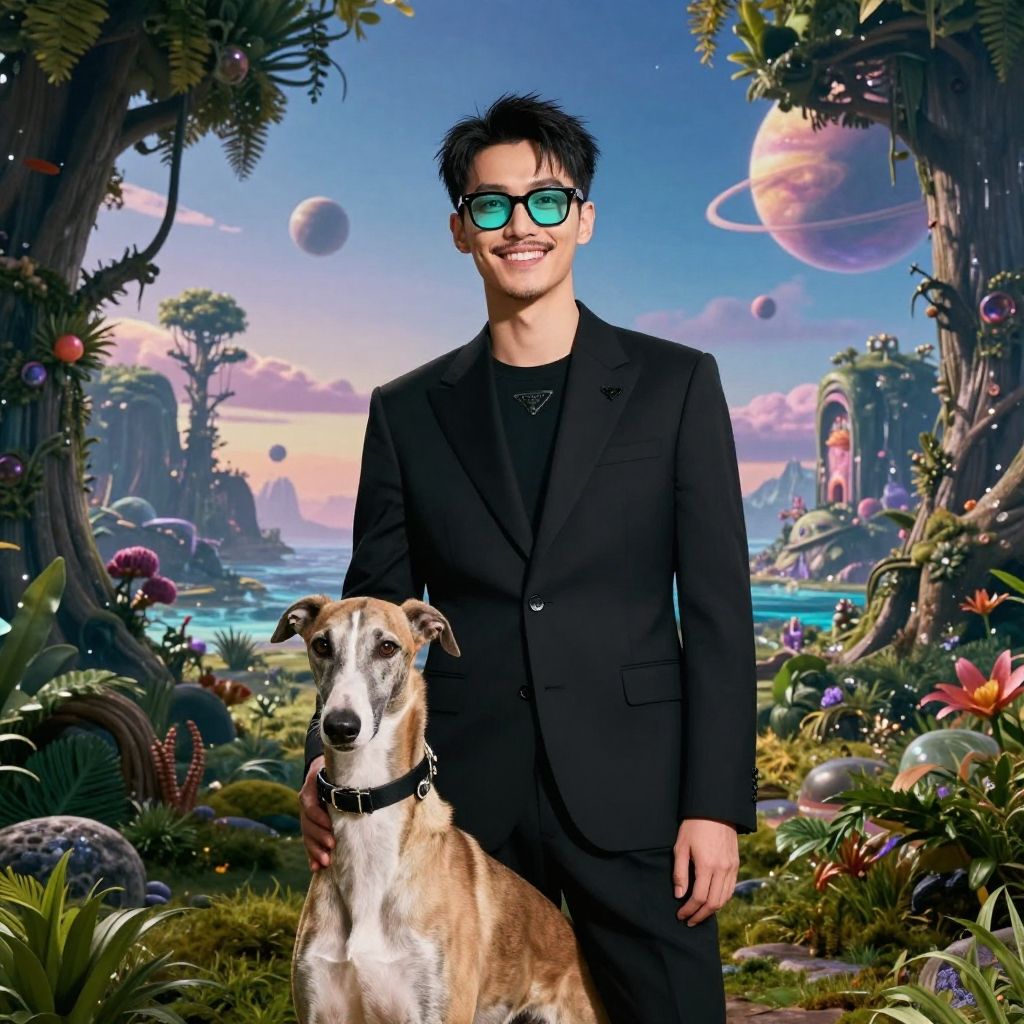 ((asian, slender, handsome, moustache, male:1.6)), ((black frame glasses, turquoise gradient-tinted lenses:1.5)), ((wearing prada suit, smiling, perfect teeth:1.4)), (male posing with regal hound, greyhound:1.6), alien landscape, sky, foliage, trees, planets, sea, dreamy, vivid colors, ((alien background)), dramatic color, 2-point perspective, cinematic, whimsical.