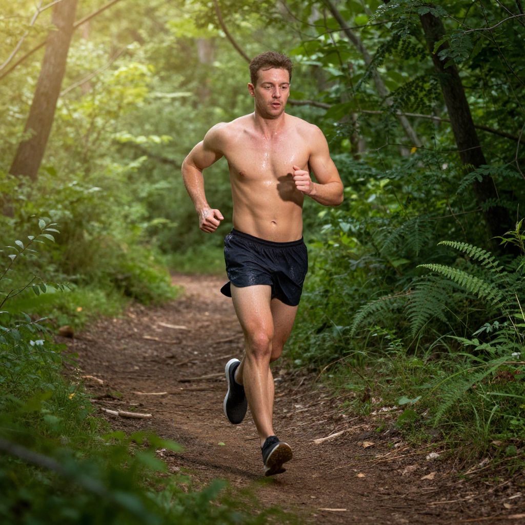 Average man shirtless jogging in a forest trail, mid-action, sweat glistening, athletic build, vibrant green foliage surrounding, morning mist, cinematic lighting, energetic vibe