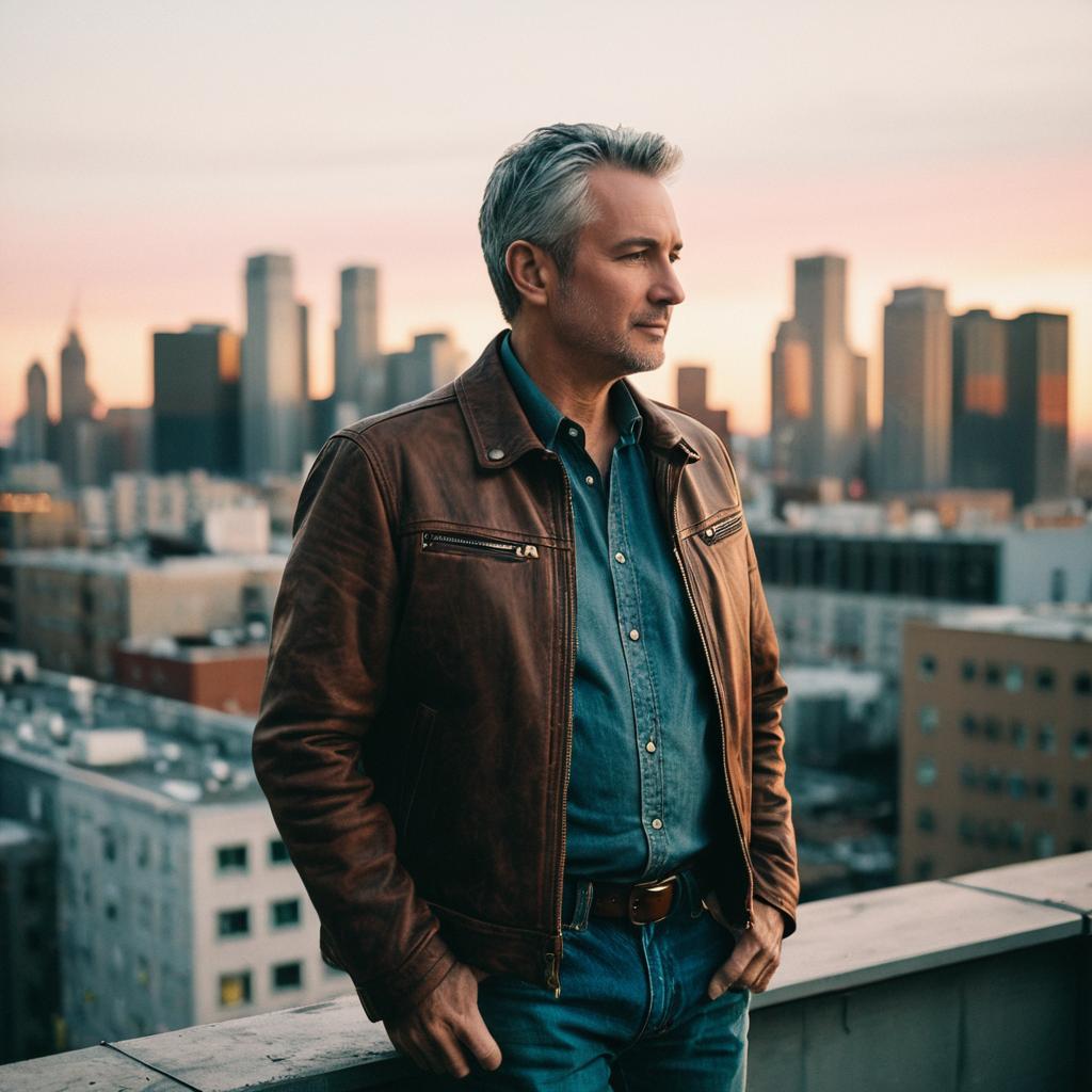 An elderly man with a white beard wearing a brown leather jacket and beige pants standing on an abandoned rustic barn with weathered wooden beams and soft dusk light, candid street style, medium depth of field, warm natural lighting, muted color palette with soft browns and deep blues