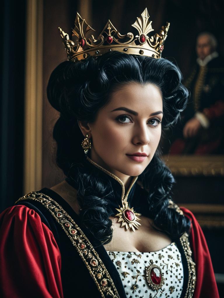 Person in Queen Costume, photorealistic regal cosplay portrait, cinematic realism