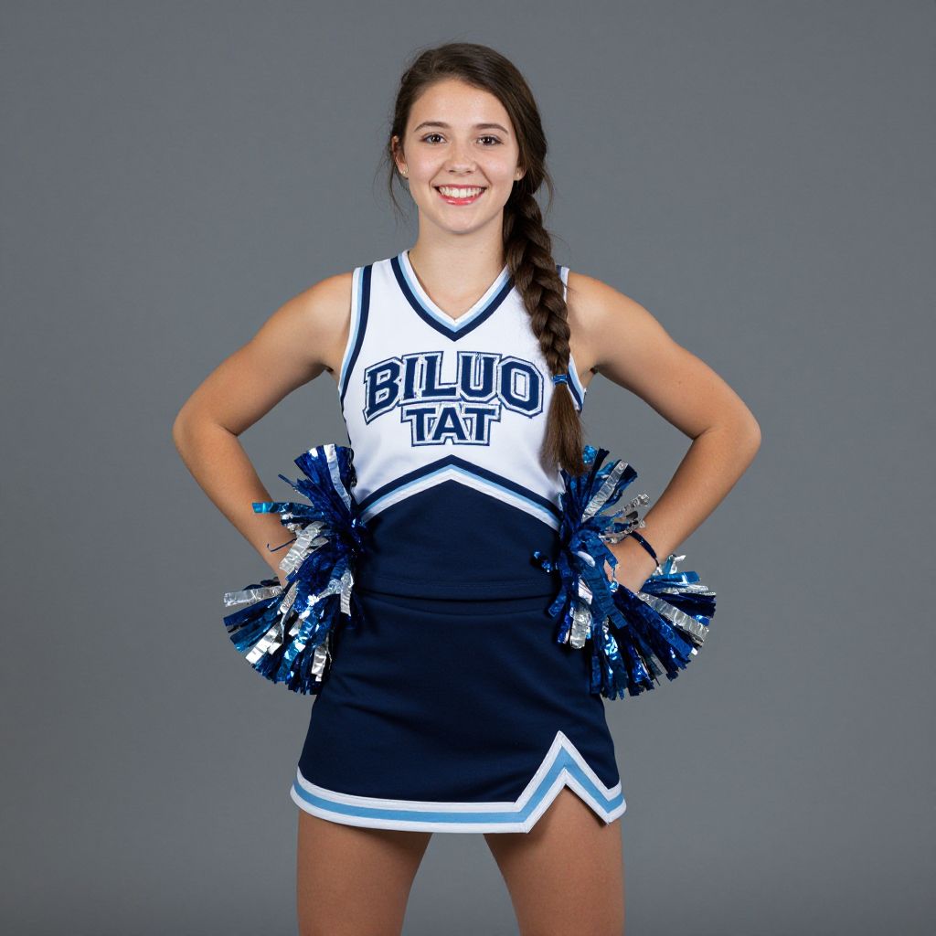 Photograph of a smiling young woman with long dark hair in a braid, wearing a black and white cheerleader uniform with "BLU" on