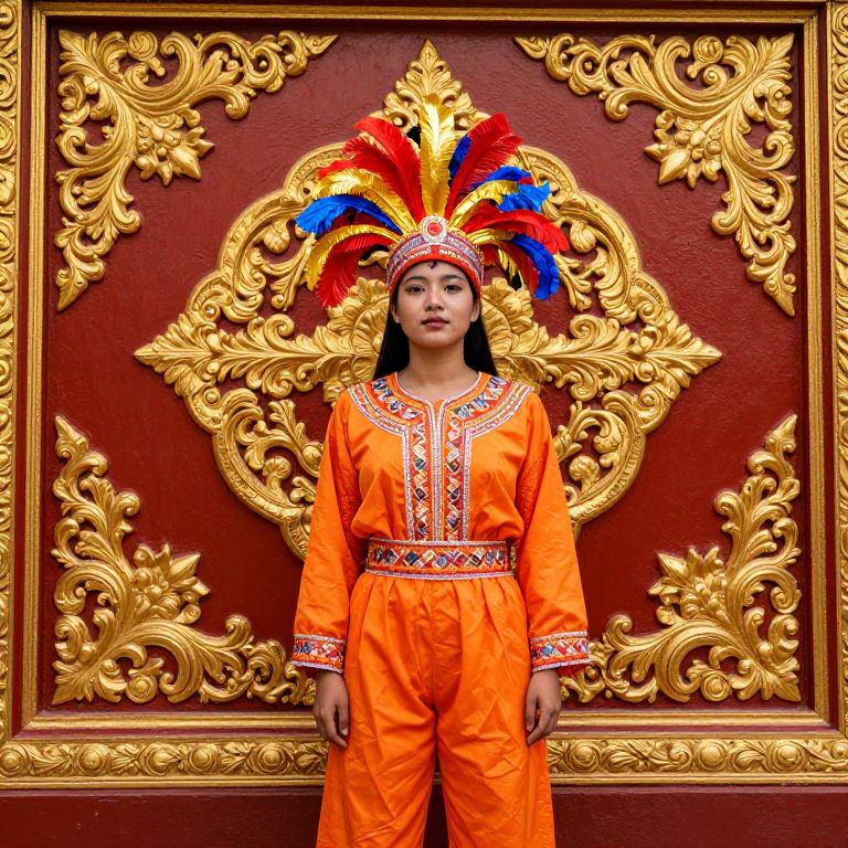 A person wearing an vibrant orange outfit with intricate patterns, adorned with a colorful, flowing headdress featuring bright red, gold, and blue elements, stands confidently in front of a grand wall decorated with rich red and gold patterns, including ornate scrollwork, floral motifs, and metallic accents. The setting exudes a festive, cultural atmosphere with warm lighting that highlights the textures and colors of the outfit and decorations.