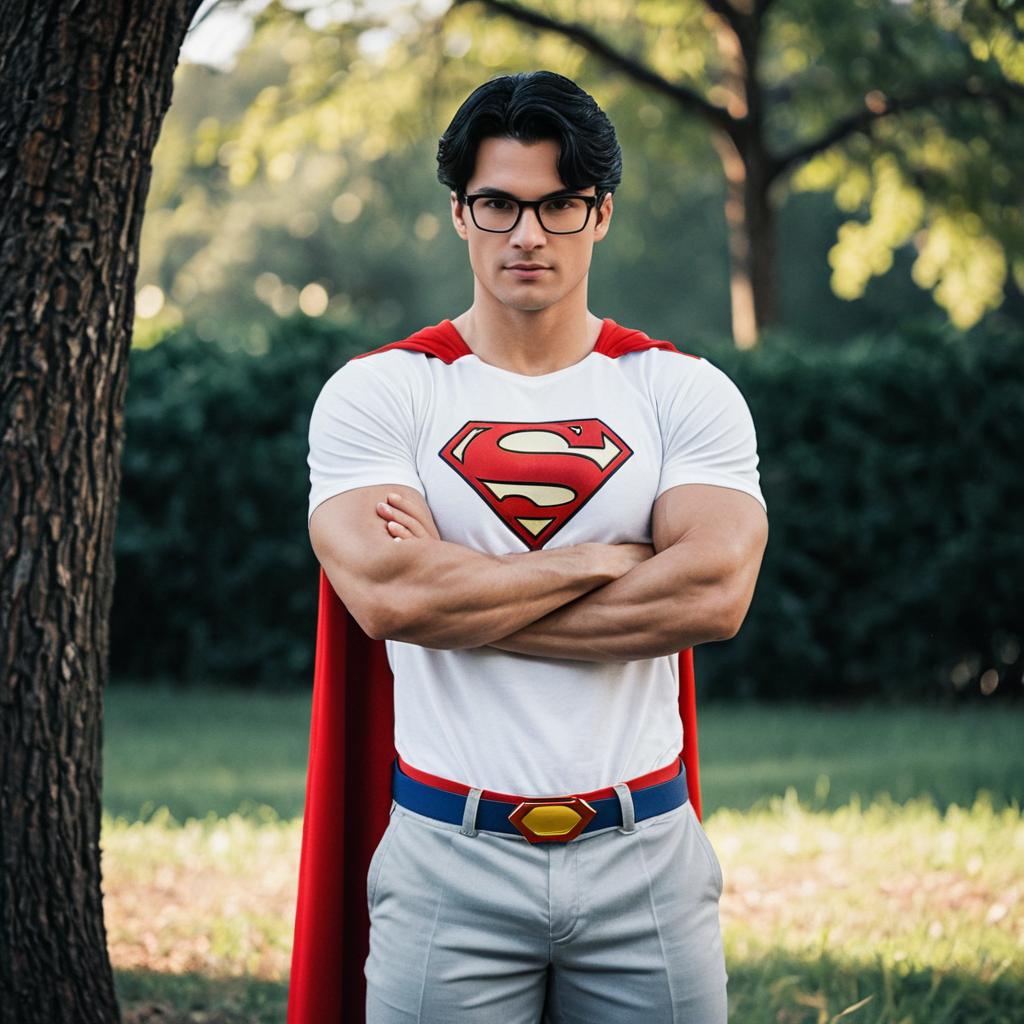 A muscular young man wearing a Superman cosplay outfit consisting of a white shirt with the iconic Superman logo, a red cape, blue and red belt, and grey pants. He has black hair and glasses, stands outdoors near a tree with arms crossed, looking confidently at the camera. The background is lush and slightly blurred, indicating a park or garden setting.