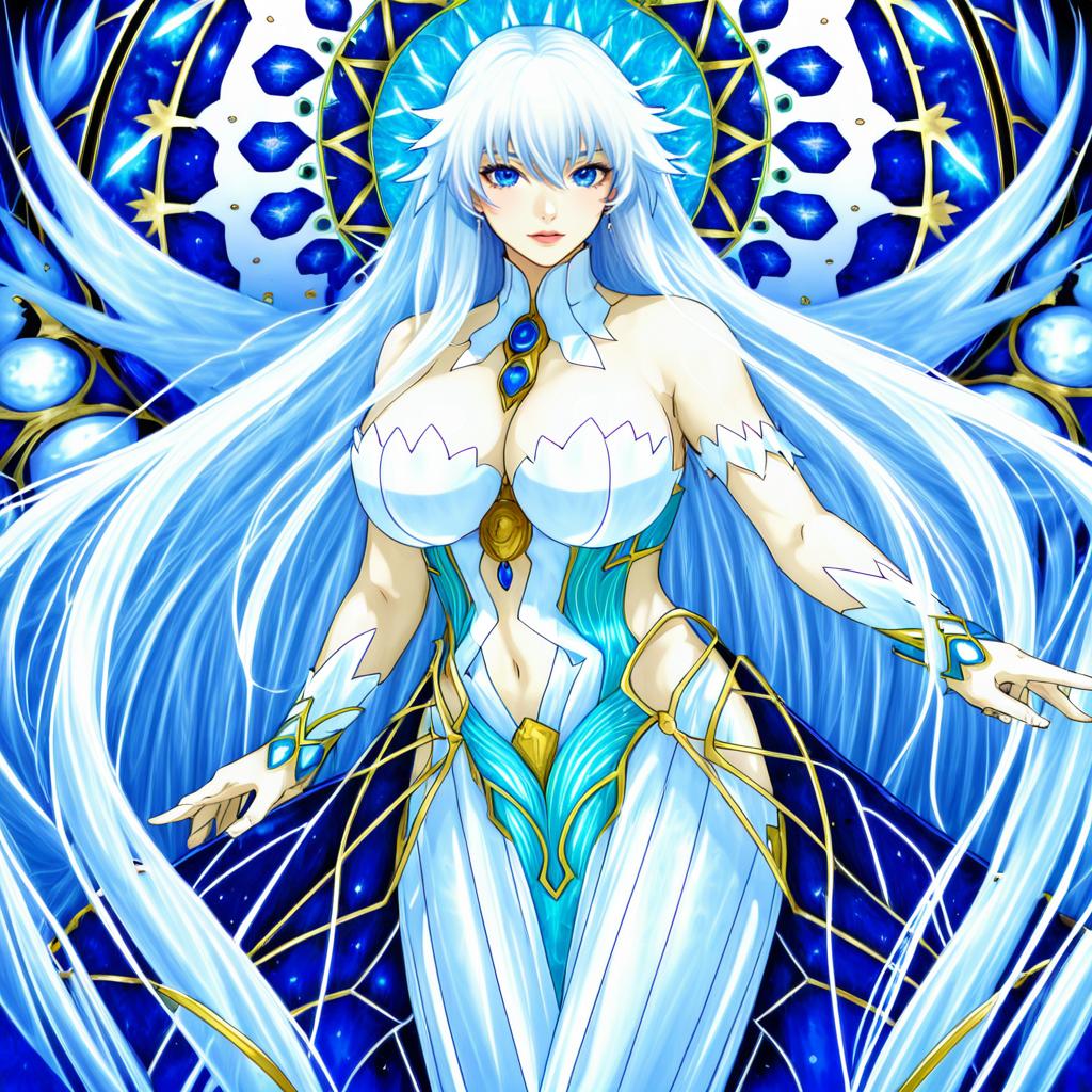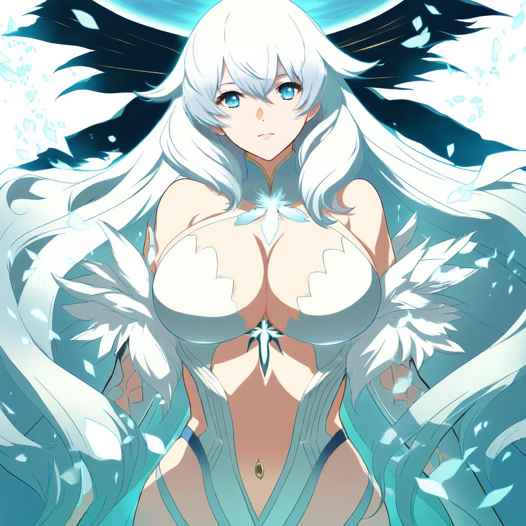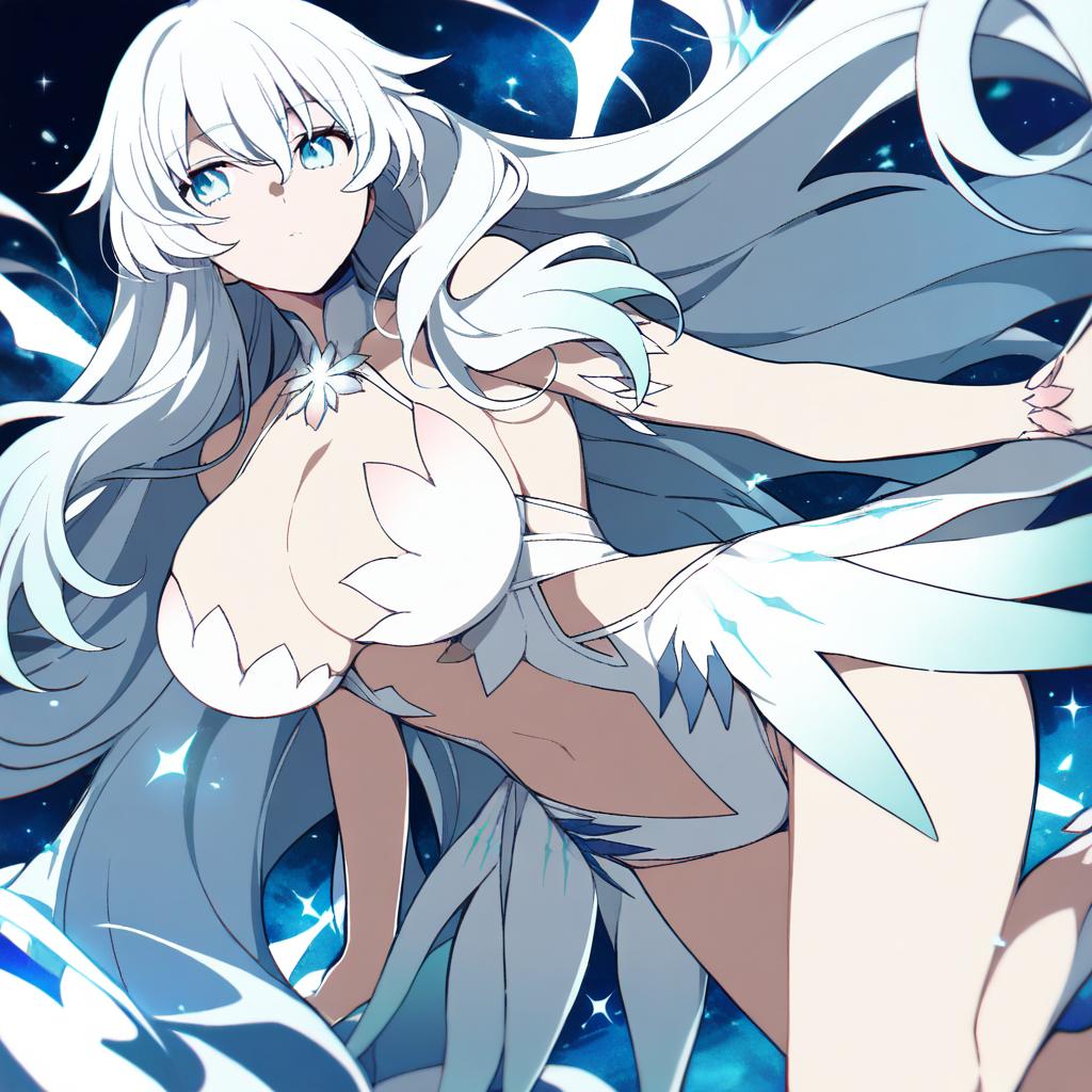 Artemis (fate), fate/grand order, 1girl, blue eyes, hair between eyes, long hair, white hair, very long hair, large breasts, cleavage, navel, bare shoulders, by artist robo mikan, anime