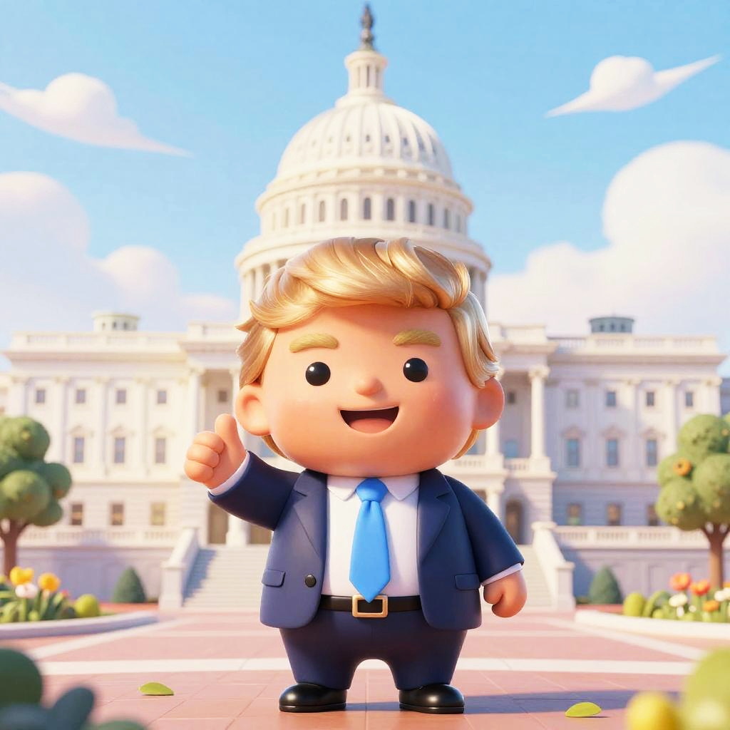 Cute Donald Trump caricature, chibi style with oversized head and bright expressive eyes, playful smile, standing in a cartoonish White House garden backdrop, vibrant colors, soft shading, whimsical and lighthearted atmosphere