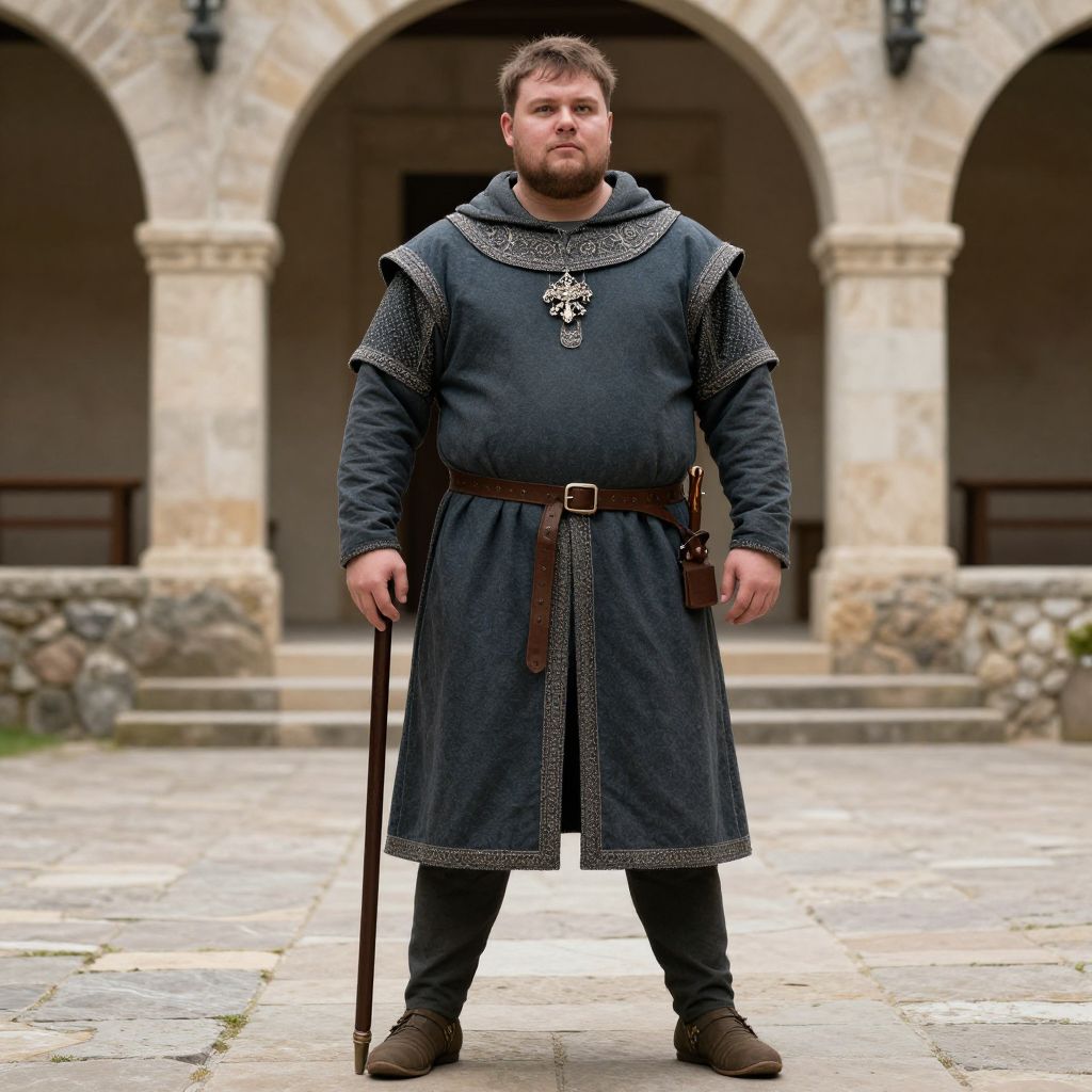 Photograph of a bearded, Caucasian man with a sturdy build, standing confidently in a medieval courtyard. He wears a dark blue, long-sleeved tunic with intricate silver trim and a brown belt, along with black pants and brown shoes. A leather pouch hangs from his belt, and he holds a wooden staff in his right hand. His tunic features a silver emblem on the chest. The background includes stone archways with a textured stone wall and a cobblestone ground. The lighting is natural, highlighting the textures and colors of his attire and the stone architecture.