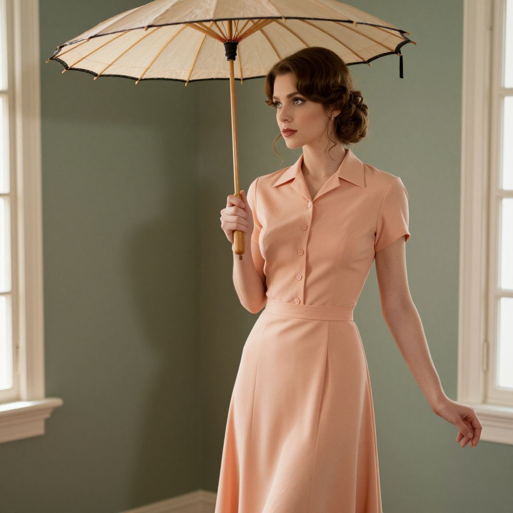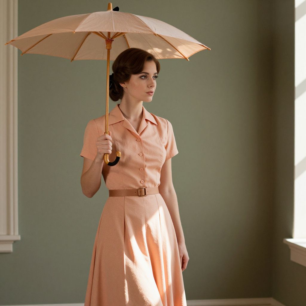 Photograph of a woman standing in a softly lit room with green walls and white-framed windows. She has fair skin, dark wavy hair styled in an elegant updo, and wears a peach-colored, short-sleeved, button-up dress that reaches her ankles. She holds a beige, paper umbrella with a black rim in her right hand, raised above her head. Her left arm hangs by her side. Her expression is thoughtful, and she gazes slightly to the left. The room has a calm, vintage ambiance. The lighting creates gentle shadows, enhancing the serene atmosphere.