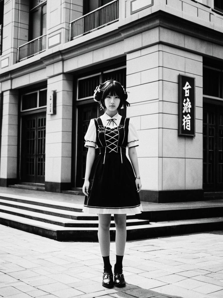 Genshin Impact Dress Game, woman in a black and white dress standing in front of a building