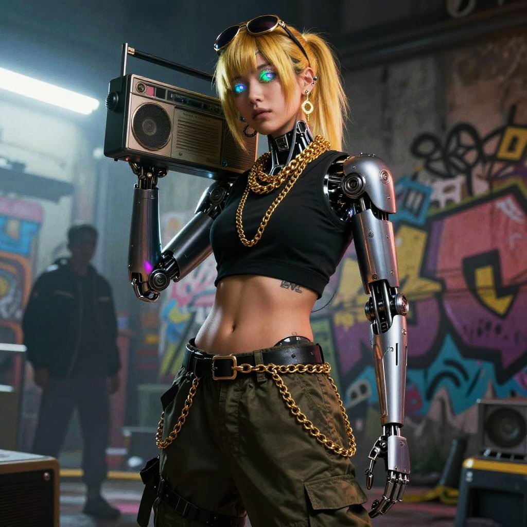 Cyberpunk photograph of a blonde, green-eyed, robotic woman with black crop top, green pants, chains, holding a boombox in graffiti-l