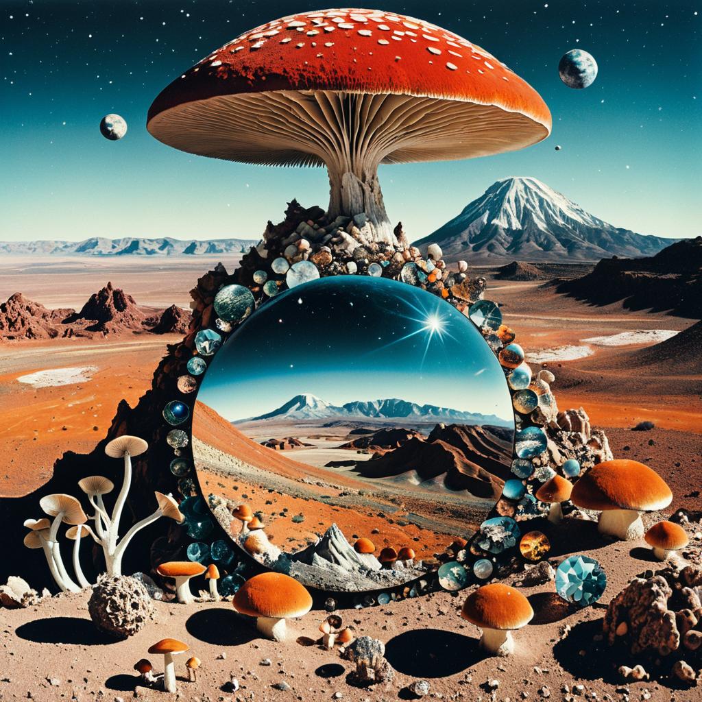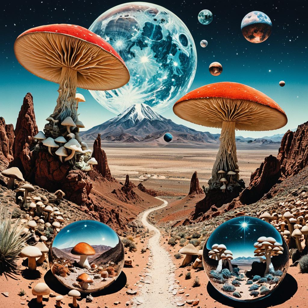 Surreal Psychedelic collage of spliced photographs, mushrooms, crystals, alien landscapes, desert landscapes, mountain landscapes, space, planets, orbs, fractals, contrasting warm and cool hues