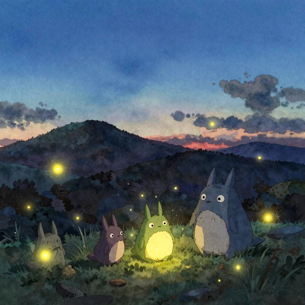 Studio Ghibli mountains towering over a quaint village, vibrant wildflowers in foreground, magical creatures peeking from trees, detailed hand-drawn style, nostalgic and peaceful mood