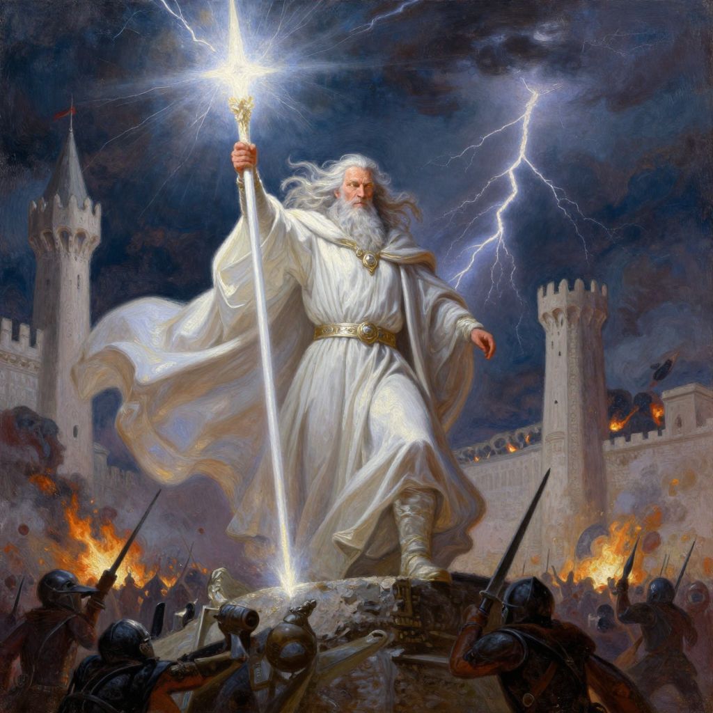 An epic and breathtaking scene of Gandalf the White, captured in the heat of battle during the Siege of Minas Tirith, He stands fearlessly on the city’s battlements, his resplendent white robes and flowing cloak billowing in the wind, His gleaming white staff radiates a blinding light, cutting through the darkness of the battlefield below, His silver hair and beard flow like a mane, and his piercing eyes blaze with a fierce, unyielding determination, Around him, the chaos of battle unfolds—Orcs swarm the city walls, catapults hurl flaming projectiles, and the dark sky is split by bolts of lightning, Gandalf’s stance is powerful and commanding; he raises his staff high, emitting a radiant light that repels the shadows of Mordor and ignites hope in the hearts of the soldiers fighting below, The city’s iconic white towers and stone walls stand in stark contrast against the smoky, war-torn landscape, The lighting is dramatic, with shafts of bright, divine light piercing the gloom, illuminating Gandalf as a beacon of hope and defiance, Oil Painting, surreal, digital artwork, Impressionism, impressionist painting, loose brushwork, light and shadow play, captures feeling over form, figure-studies, oil-painting, romanticism, painting, elegance, opulence, painterly, textural, artistic, vivid, vibrant