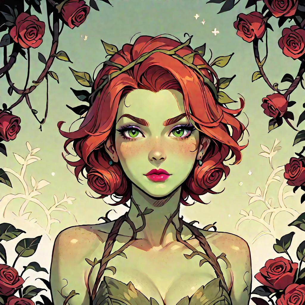 Digital illustration of a female character inspired by Poison Ivy, featuring green skin and bright green eyes. She has short, wavy red hair adorned with thorny vines and roses. The character wears a green leaf-themed leotard with thorny vines wrapping around her shoulders and chest. The background includes large red roses and dark green leaves, enhancing the botanical and nature-inspired theme. The artwork is styled reminiscent of Adam Hughes with a blend of western cartoon aesthetics.