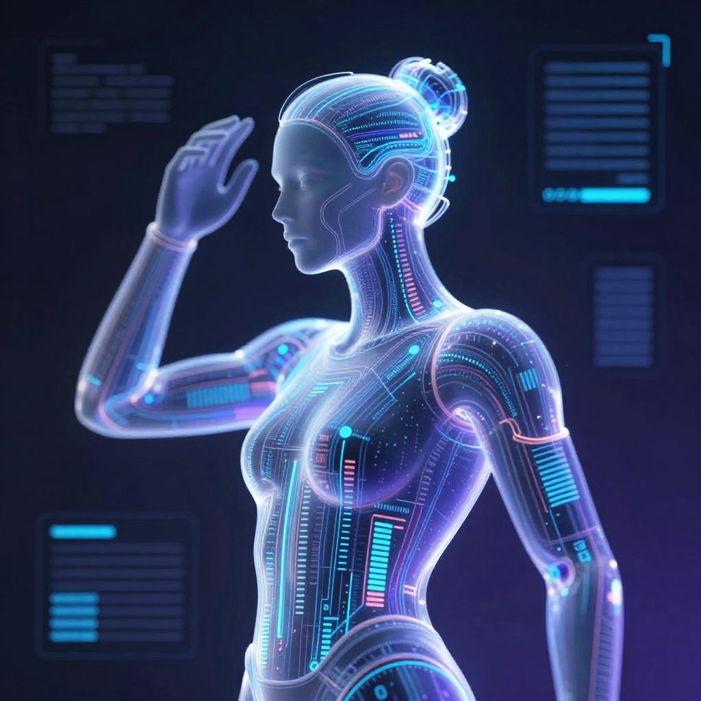 AI profile picture, stylized AI entity with holographic effects, transparent layers showing internal data streams, cool tones of blue and purple, dynamic pose, futuristic UI elements overlay