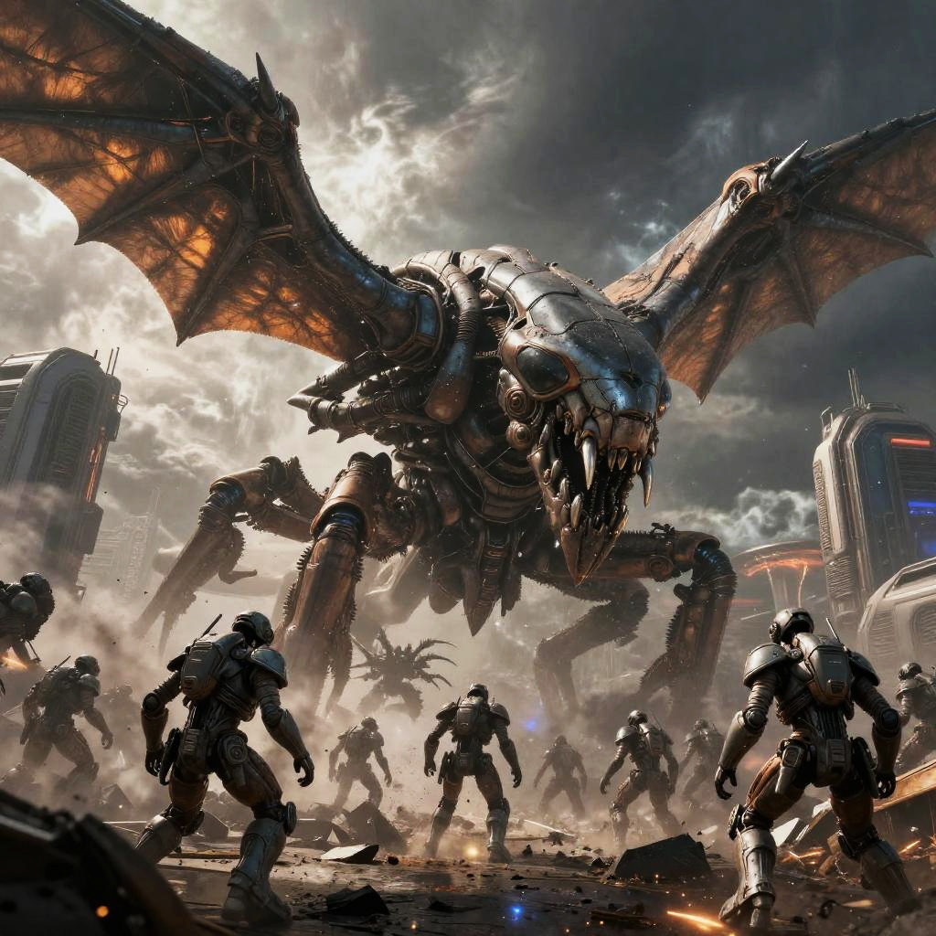 Helldivers 2 Hive Lord commanding alien forces under a stormy sky, monstrous hive creature with insectoid wings, razor-sharp mandibles, futuristic war zone filled with chaos and destruction