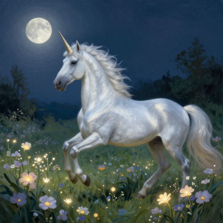 Envision a surreal and impressionistic landscape where a regal unicorn majestically traverses an expansive lavender field beneath a star-studded sky. From a bird's-eye perspective, the scene reveals the mythical creature effortlessly leaping over shimmering pools of molten amber, casting brilliant streaks of light behind it. The delicate interplay of soft pastels and intricate brushwork creates a dreamlike ambiance, captivating the viewer with the ethereal allure and enigmatic charm of this fantastical realm.