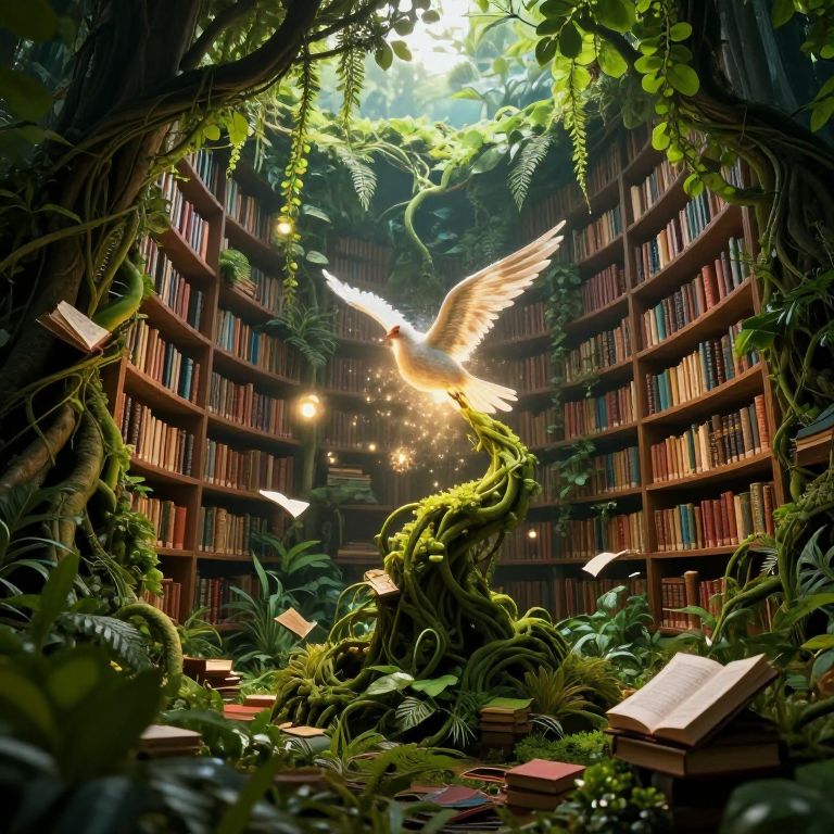 Digital illustration of a glowing white dove with outstretched wings, flying above a lush, jungle-like library with towering bookshelves and scattered books.