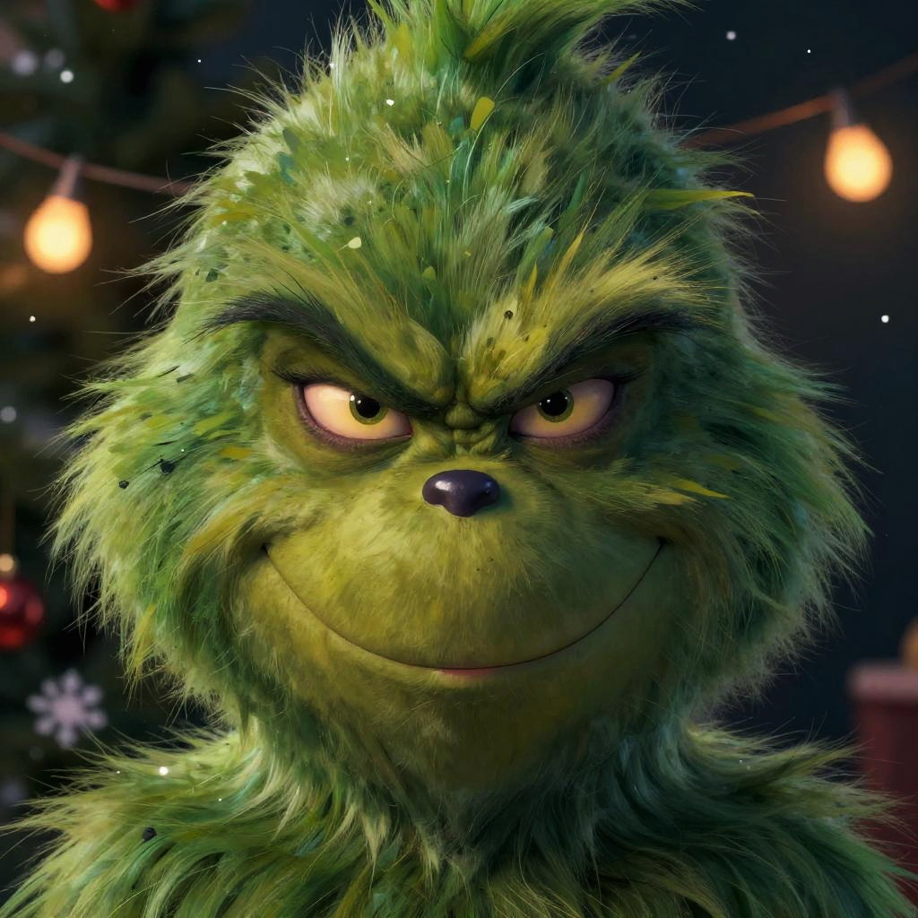 Detailed grinch face pictures focusing on the iconic sly smile and expressive eyes, with textured green fur and a festive background of holiday lights and snowflakes, painted in a semi-realistic fantasy art style.