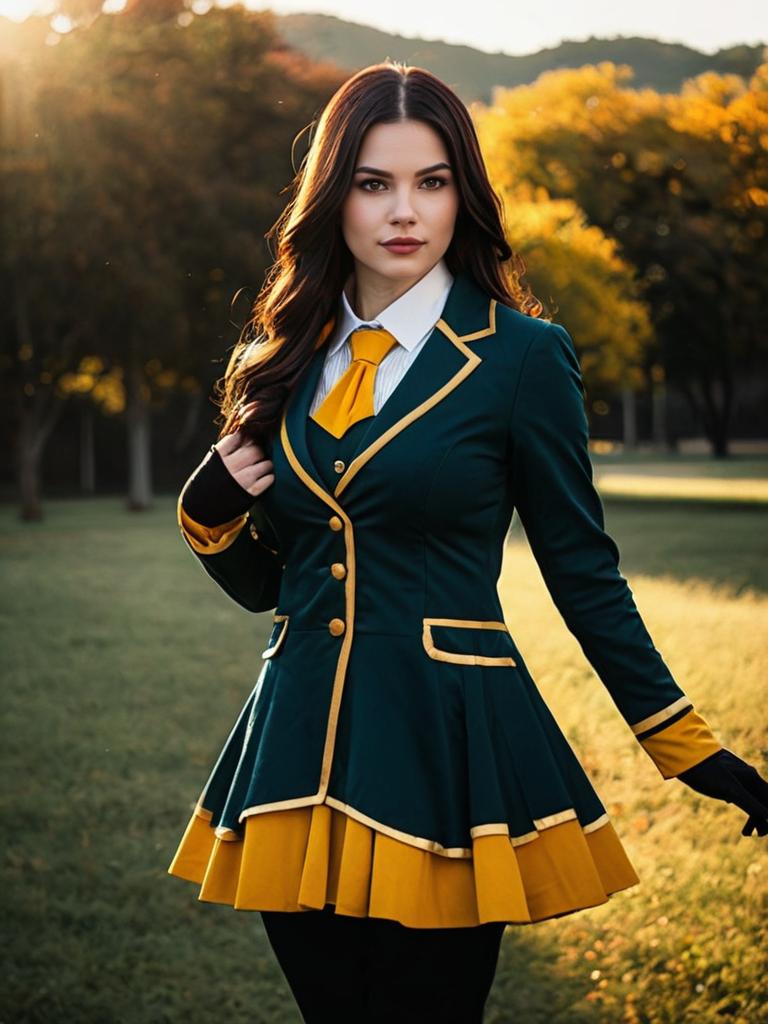 Photo-realistic cosplay photo of person in airi (band) (blue archive) costume. 1girl, green eyes, long hair, black hair, brown hair, white shirt, white skirt, pleated skirt, blue jacket, open jacket, halo, green halo, long sleeves
