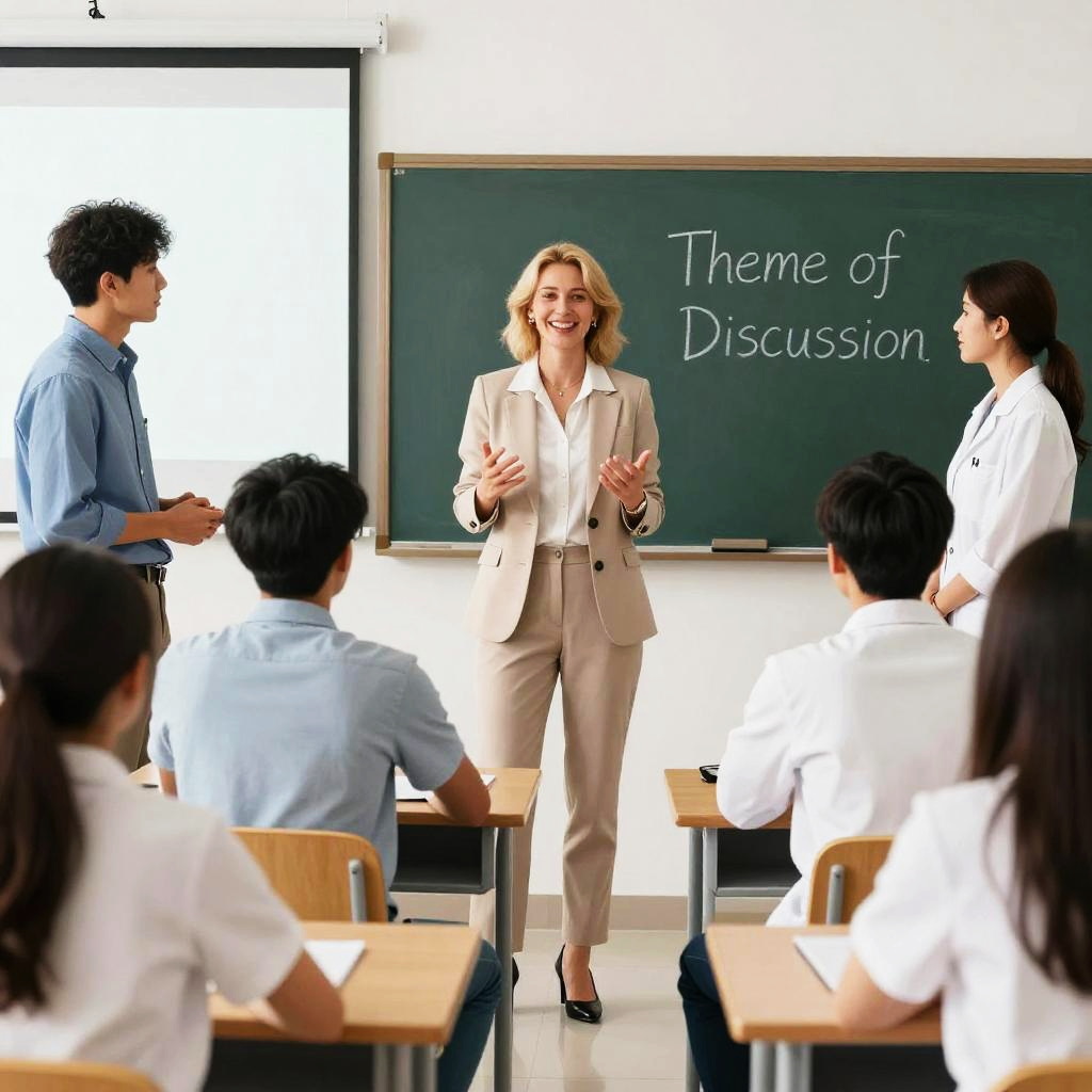 Photograph of a diverse group of six young adults in a classroom. They're seated around a table with books and notebooks, smiling and engaged in a discussion. The teacher, a bald man in a blue shirt, is gesturing towards a chalkboard with "Theme for today" written on it. The background includes a whiteboard and bright classroom lighting. Everyone looks happy and focused.