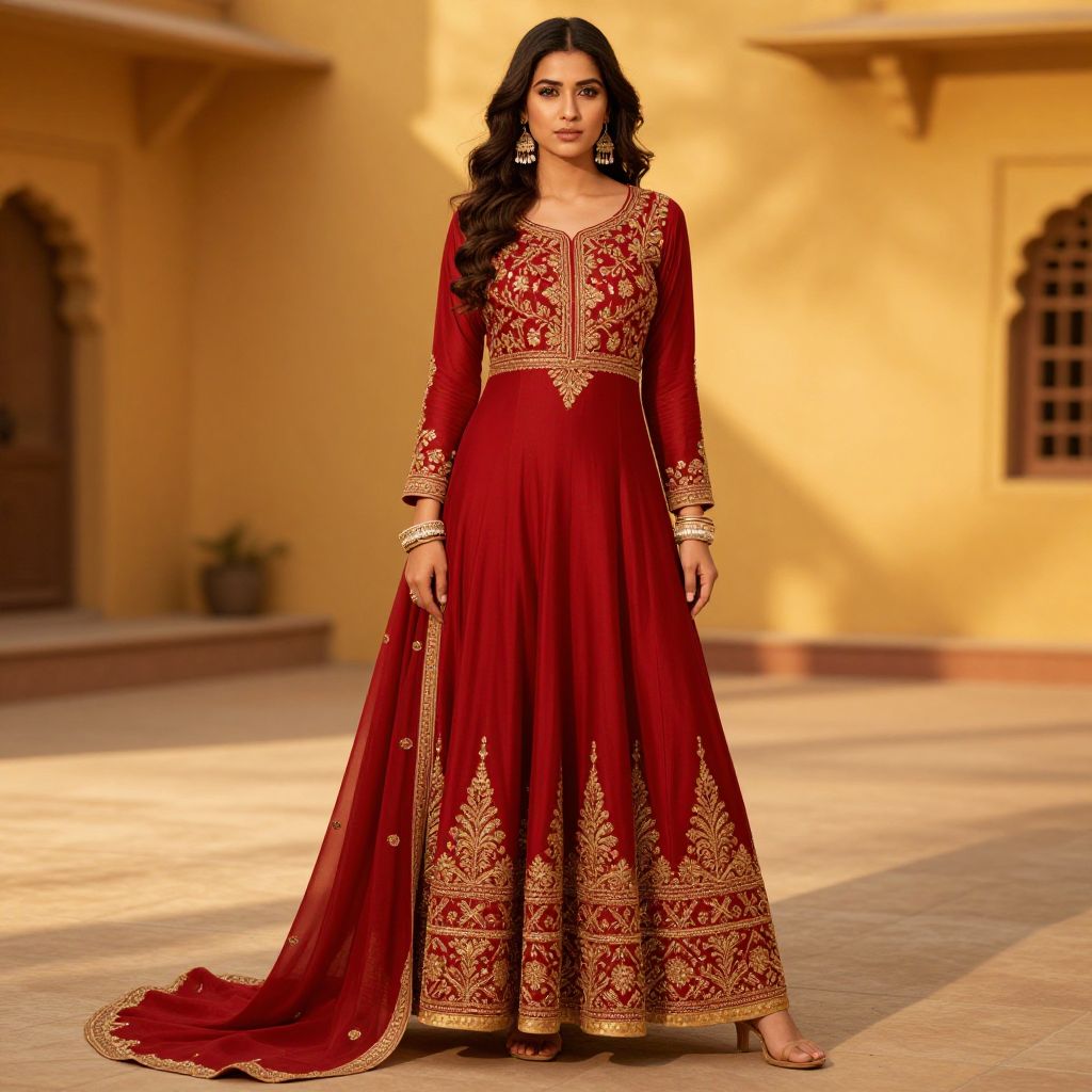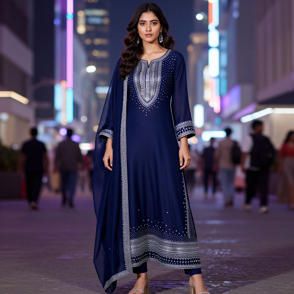 A luxurious shalwar kameez in rich emerald and deep maroon tones, styled with a finely tailored blend of silk and cotton, draped elegantly by a graceful woman in a traditional Indian market square, warm ambient glow, realistic fabric render, vibrant street scene inJaipur.