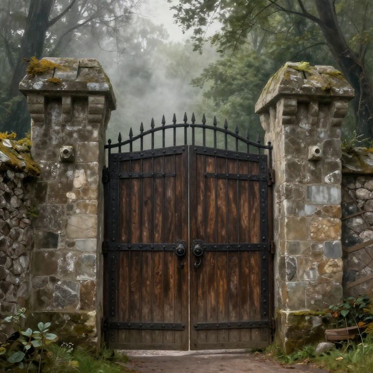 Secured, an ancient castle gate reinforced with iron bars and heavy wooden doors, surrounded by mist and dense forest, evoking feelings of impenetrable defense and medieval protection, detailed and atmospheric painting