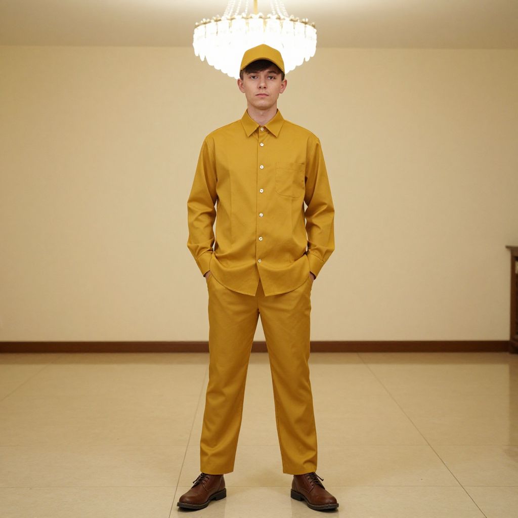 "mustard shirt costume, 1boy, male focus, solo, hands in pockets, standing, indoors, hat, full body, looking at viewer, shirt, chandelier, pants, brown footwear, shoes, yellow pants, long sleeves, yellow headwear, closed mouth Realistic photo of casual sexy person with pretty face"