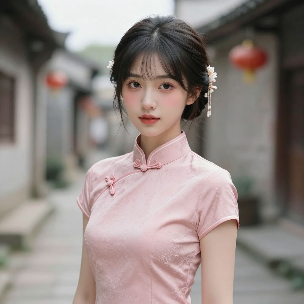 Anna Zak, Cute beautiful girl, standing in an old village, wearing pink cheongsam, hair ornament, light makeup, (detailed face, perfect face, perfect eyes, realistic eyes, expressive eyes), looking at viewer, outdoors, (masterpiece), ((ultra-detailed)), (highly detailed), (expressionless), (best quality:1.2), (1girl:1.2), High quality texture, intricate details, detailed texture, High quality shadow, depth of field, perspective, blush, perfect body, distinct_image, (lustrous skin), solo focus