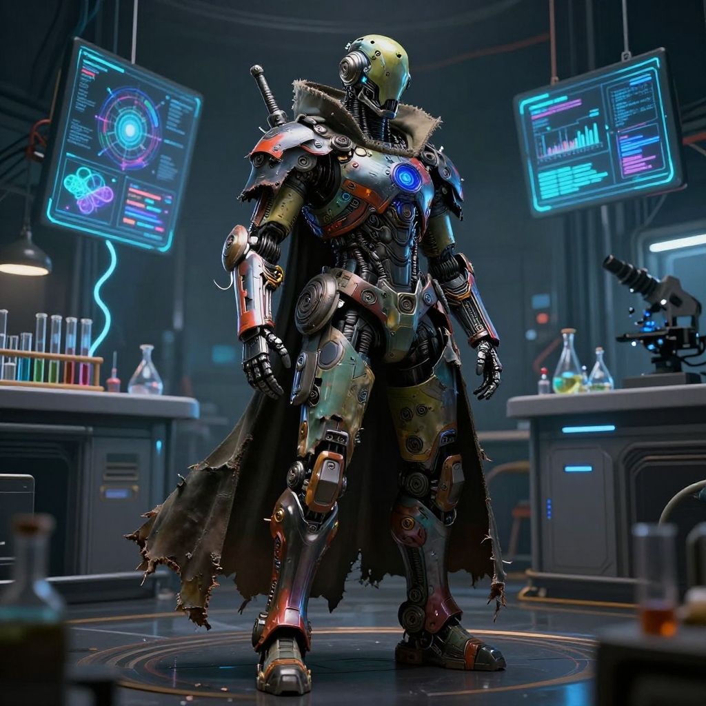 Photorealistic CGI of a cybernetic warrior with glowing blue accents, wearing a tattered cloak, standing in a futuristic lab with glowing holographic