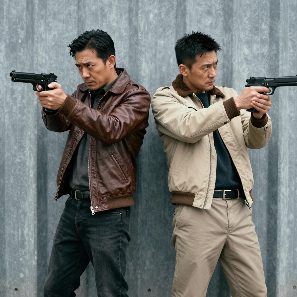 Two men with guns, leaning against a corrugated metal wall. Left man in brown leather jacket, dark pants. Right man in beige jacket, beige pants, intense expressions. Both aiming guns forward, hands steady. Image has a cinematic, slightly grainy style.