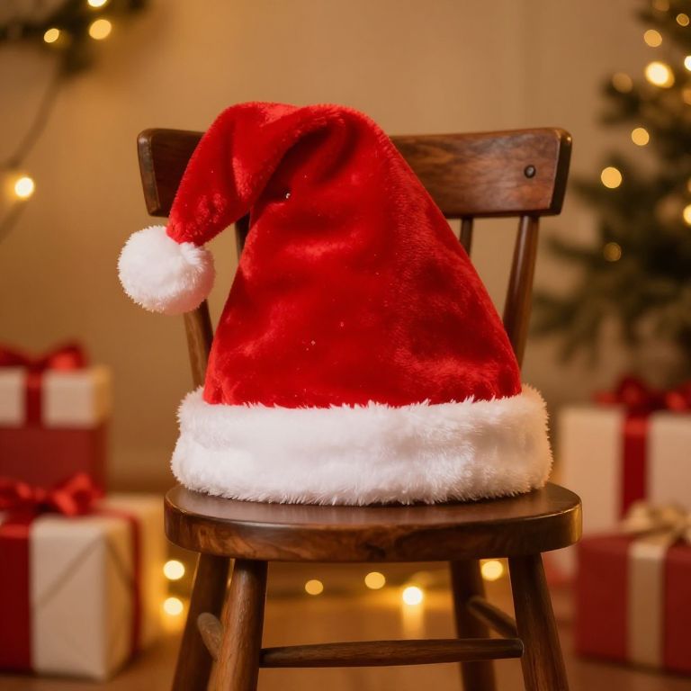 Free Santa hat image, a playful scene featuring a red Santa hat with white pompom on a rustic chair, surrounded by wrapped Christmas gifts and twinkling fairy lights, warm cozy room setting, shallow depth of field, holiday spirit mood