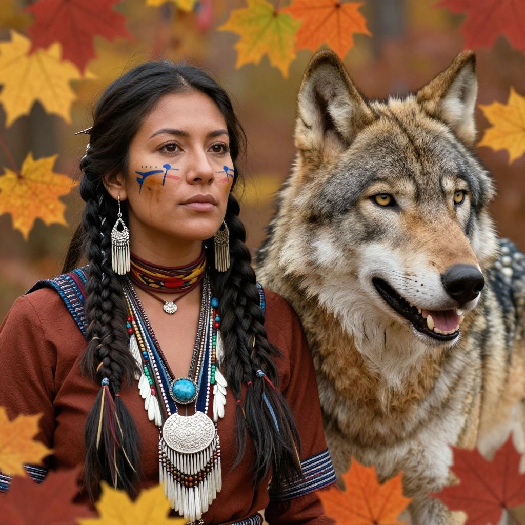 Portrait of a beautiful Native American woman and wolf side by side, surrounded by vibrant autumn leaves, detailed face paint and jewelry, powerful and serene atmosphere, photorealistic style