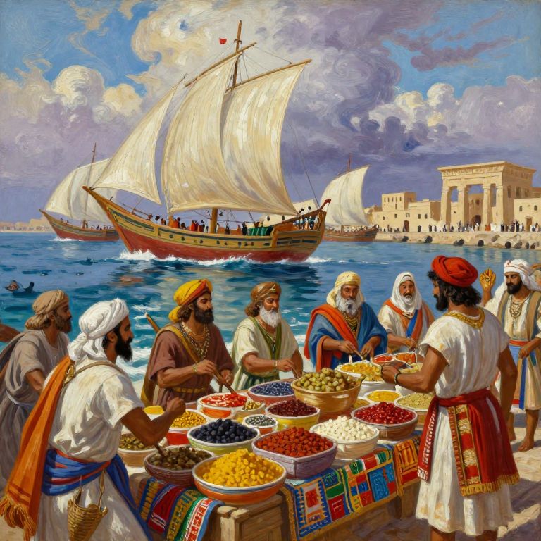 This vibrant digital painting depicts a lively marketplace by a coastal harbor. In the foreground, six Middle Eastern men, wearing colorful robes and headscarves, gather around a wooden table laden with bowls of fruits and spices. A large, white-sailed ship dominates the midground, sailing on the blue water. In the background, an ancient, beige temple-like structure stands on the shore. The sky is bright with scattered clouds. The men, with diverse skin tones and beards, engage in conversation and haggling. The table is adorned with a patterned cloth, adding to the rich, cultural atmosphere.