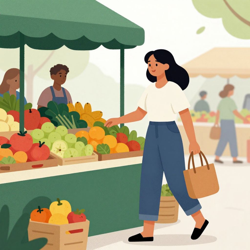 This digital illustration depicts a woman with medium brown skin and short black hair, wearing a white short-sleeved shirt and a teal high-waisted skirt, holding a beige handbag. She stands at an outdoor market stall with an orange and white striped awning, filled with colorful vegetables like tomatoes, cucumbers, and bell peppers. In the background, two blurred figures in yellow and blue shirts are talking at another stall. The scene is bright and cheerful with soft pastel colors, and there are leafy green plants in the foreground. The style is clean and minimalist with bold outlines and flat colors.