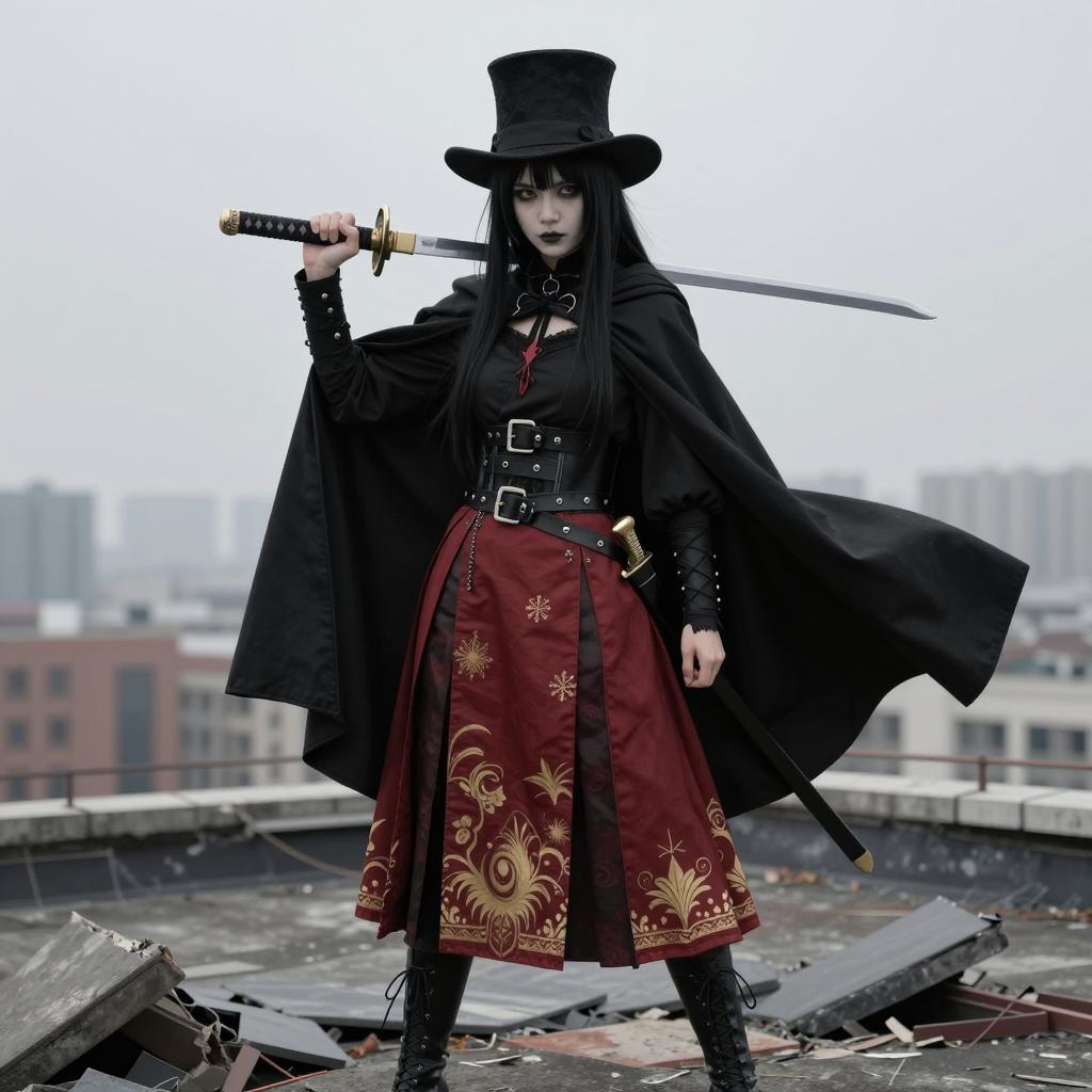 Woman in Gothic-style photograph. Black cap with white trim, long black hair, pale skin. Wearing black and purple ornate dress with gold chains, black cape. Holding black gun in right hand, saluting with left. Background: overcast sky, industrial setting. Intense facial expression.