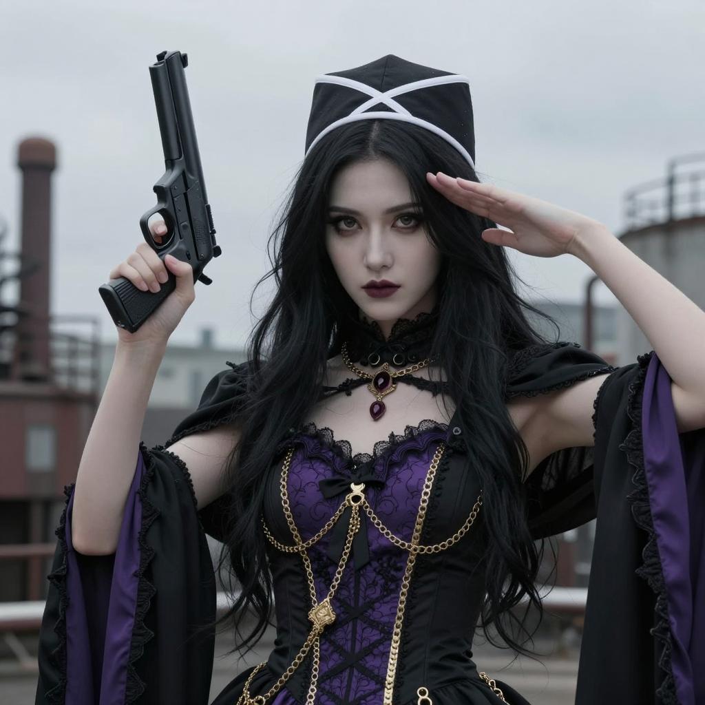 Portrait of a young woman with pale skin and long black hair dressed in a gothic-style black and purple ornate corset dress with gold chains and a black cape. She is wearing a black cap with white trim and has dark makeup with an intense expression. The woman holds a black handgun in her right hand and salutes with her left hand. The background shows an overcast sky and an industrial urban setting with metal structures.