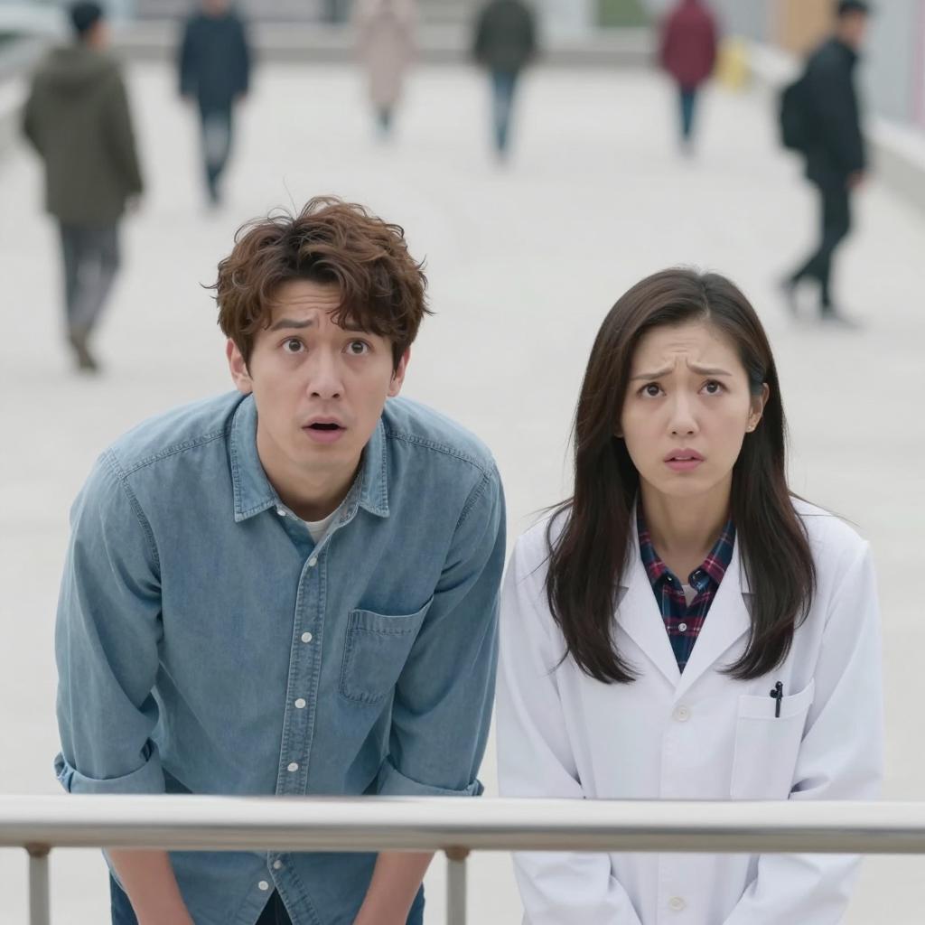 A car scene. Asian woman with long black hair, blue top, gripping steering wheel, surprised expression. Man with dark hair, glasses, blue shirt, orange tie, looking at her, right profile. Second man in blue shirt, arms visible, background. Orange car window, reflections. Intense expressions. Three people.