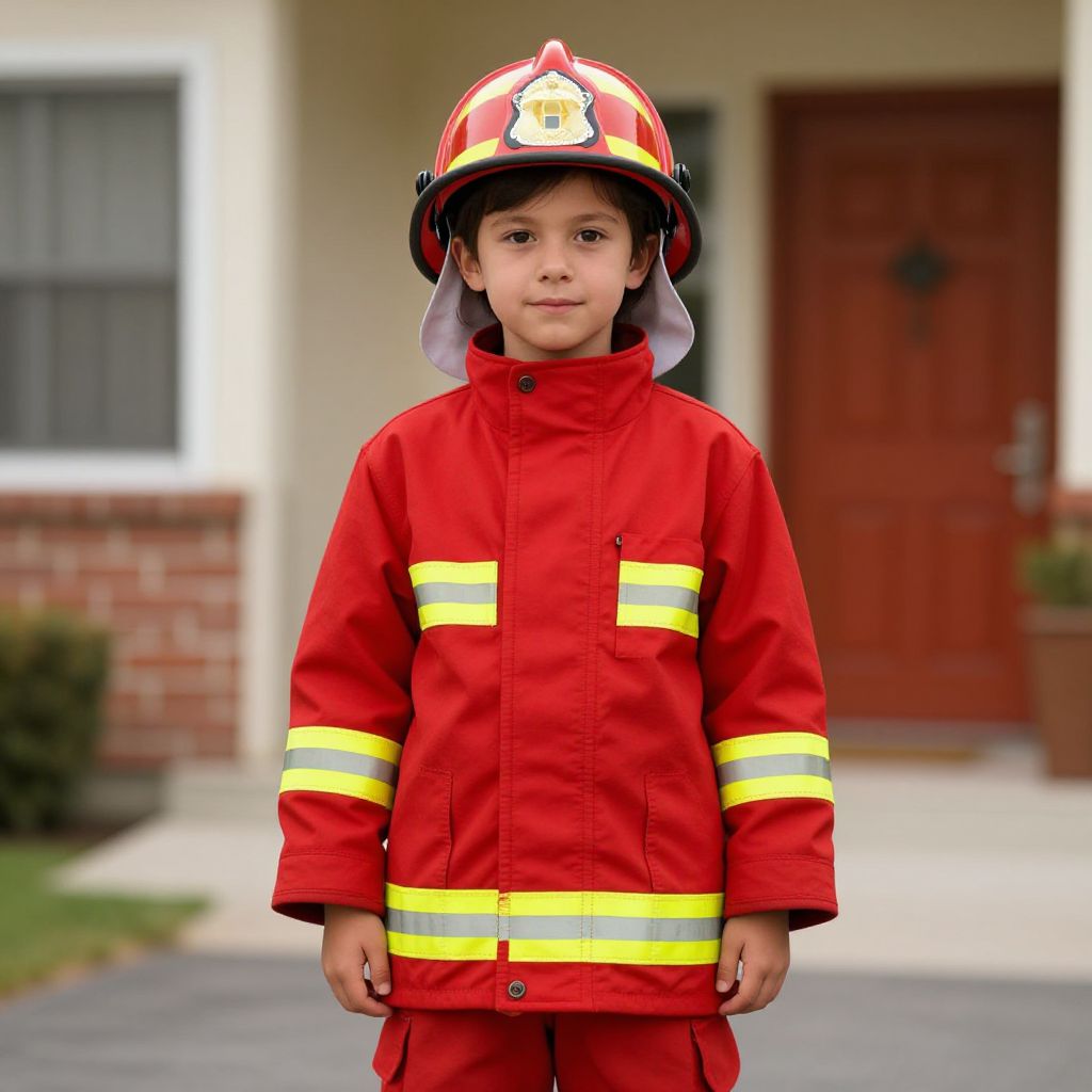 Photograph of a young boy standing outdoors, wearing a bright red firefighter's uniform with yellow reflective stripes and a matching red helmet with a white emblem. He has medium brown skin, dark eyes, and short black hair. The background shows a blurred suburban house with a red door and white-framed window. The boy's uniform is crisp and well-fitted, with a visible pocket on his left chest. The setting is daytime with soft natural light.
