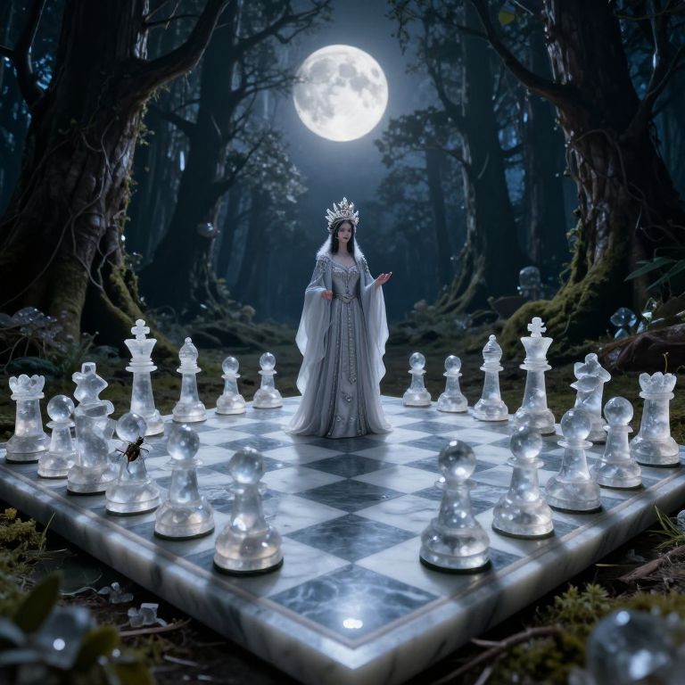 In the style of surrealistic landscapes, envision a bewitching scene in a moonlit clearing within an enchanted forest. A grand chessboard crafted from polished marble stretches across this mystical setting, its pieces replaced by ethereal crystal formations that shimmer under the silvery glow of the moon. At the heart of this whimsical tableau stands a compelling figure dressed in flowing robes and a magnificent headdress, exuding both intrigue and reverence. This captivating scene is viewed from an unconventional 'bug's-eye view', adding to its enchanting depth and allure as if through the eyes of a small insect perched on one of these crystalline pawns.