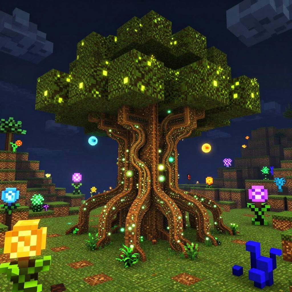 Minecraft fantasy tree with twisting bioluminescent roots spreading over a mystical terrain, surrounded by enchanted pixelated plants and magical orbs, glowing vibrant colors in a fantasy game setting, detailed block structure and surreal lighting effects