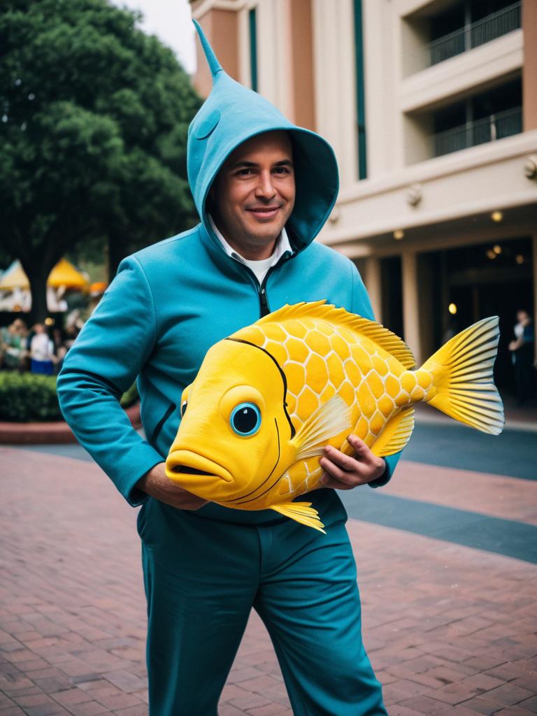 Man in Disney Flounder costume, professional cosplay photography, realistic tones