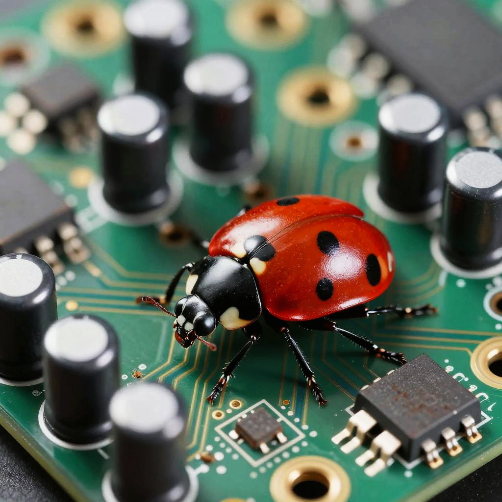 Photograph of a vibrant red ladybug with black spots, positioned on a green printed circuit board (PCB). The ladybug's shiny, smooth exoskeleton contrasts with the matte, green PCB, which features black, cylindrical components and small, square integrated circuits. The PCB's golden connectors and silver solder points add a metallic sheen. The ladybug's black legs and head are visible, with its antennae slightly raised. The close-up shot highlights the intricate details of both the ladybug and the PCB, blending natural and technological elements in a striking composition.